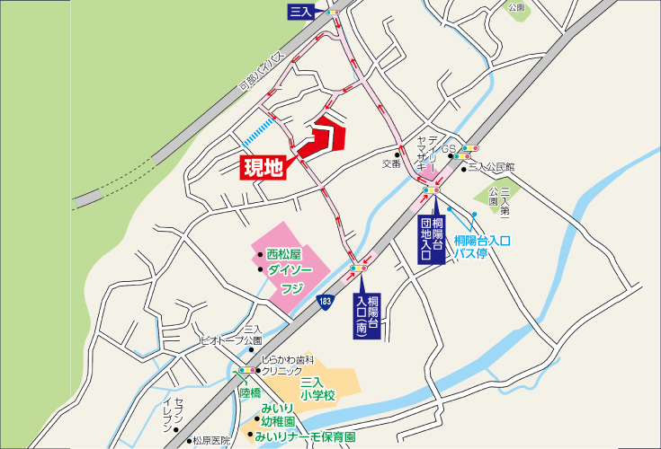 フジ三入店徒歩5分、三入小学校区 徒歩8分、三入中学校区 徒歩7分